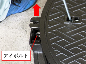 ![]() ![]() 蓋のボックス側を先に持ち上げアイボルトから抜き上げます。 |